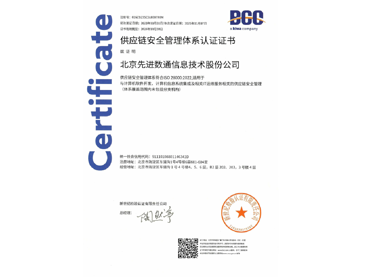 • 供应链安全管理体系认证证书